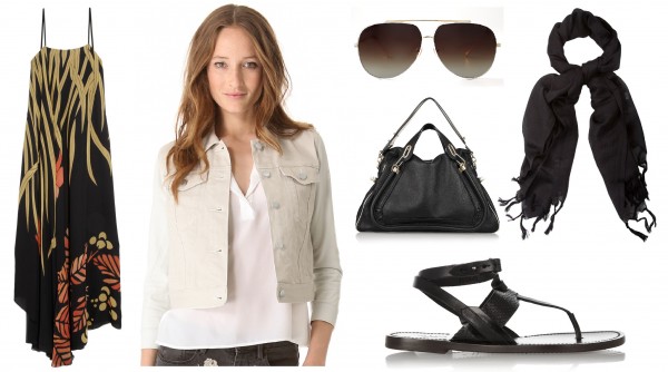 To give this jacket a more feminine vibe I wanted to choose a very billowy dress, like this Chloe one here. I kept the accessories simple and classic so it wouldn’t clash with the print of the dress or take away from the jacket. A basic black scarf like this Love Quotes one is a staple that all women should own, as well as a pair of classic aviators like these by Dita. They can be worn each and every season without having to think twice about it. To finish off the look, throw the bag over your shoulder and tie your hair in a bun and you are ready for the day.