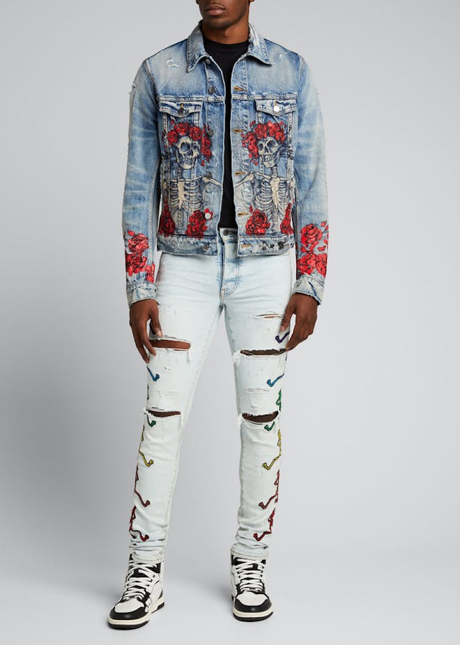 Amiri x Grateful Dead destroyed jeans in vintage light wash with graphic sides.