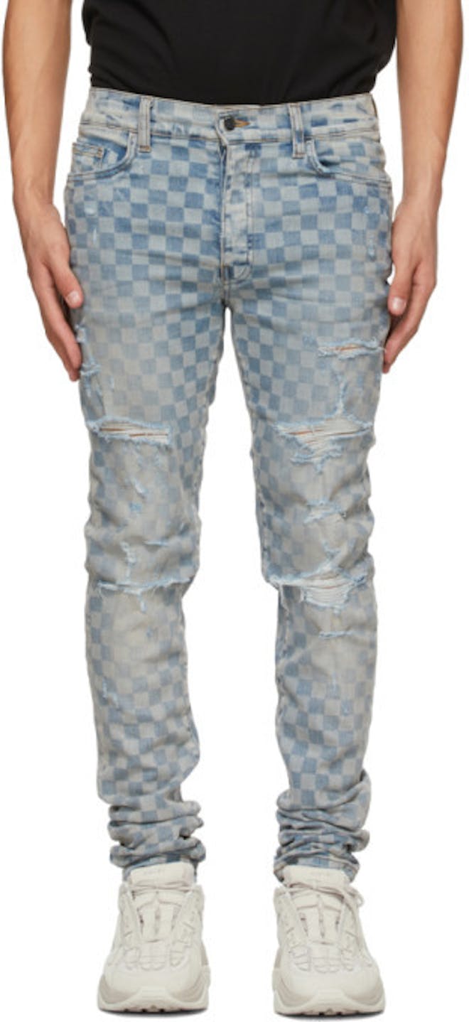 Skinny-fit Italian stretch denim jeans in blue featuring tonal check pattern thr.