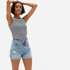 High-waisted shorts are a great way to accentuate your waist and make your legs look longer. A fitted tank top or top with a high neckline will help to balance out the proportions of the high-waisted shorts.
